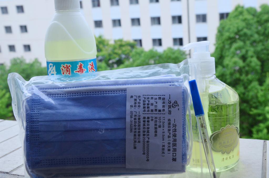 学院在8号公寓楼下大厅给各个寝室发放了洗手液、体温计、喷壶和84消毒液,并让寝室长在体温登记本每日记录,以便定期定时检查宿舍消毒情况和每位学生的实时体温状况。除此以外,学院还给各个班级发放口罩、额温枪等防疫物资,每班都还拥有一本因病缺课登记本,形成寝室长-班团-老师的反馈机制,确保了每位学生的状况能够及时知晓。食堂、教室和图书馆都采取限流的措施,保证人员尽可能的分散。学校医务室也已经准备好大量的防疫物资,一有突发情况,可以立即采取相应的措施。寝室前的黄色标线、食堂旁的洗手池、废弃口罩回收专用桶、学院发放的中药液、楼道内进行空气消毒的艾草等等。学校做了这么多的防疫措施,是为了营造一个安全的校园环境,在返校复课的情况下最大程度的减少病毒入侵的风险。