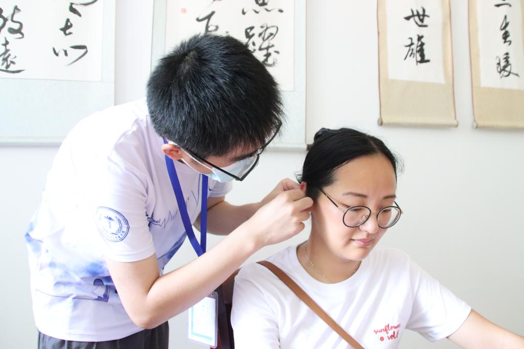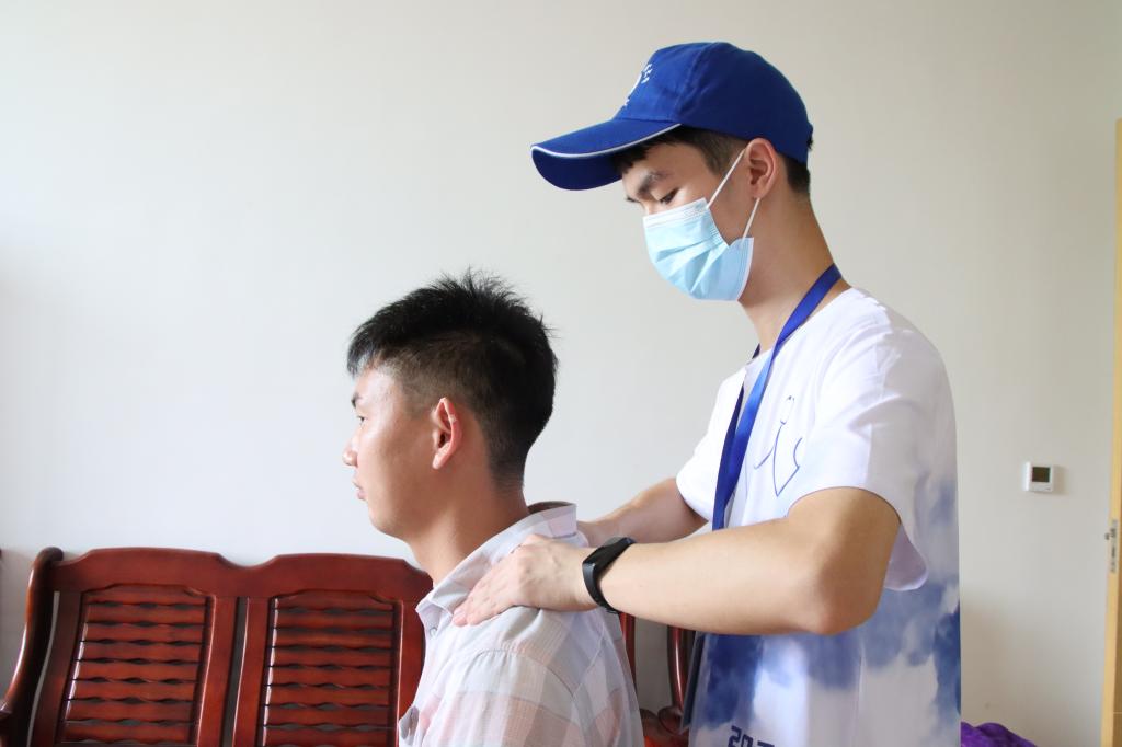 在御龙湾校区,志愿者们迅速备好义诊所需器材,并且根据实际情况对义诊项目进行优化,组织了对分校区教职工及留校儿童的专项体检工作。志愿者们先对到来的教职工进行亲切地导诊,告知其关于中医理疗的注意事项进而展开活动,并且进行刮痧、推拿、艾灸、拔火罐等中医理疗项目,以缓解疲惫。此外,志愿者们也为孩子们进行了视力检查,并帮助他们克服畏惧心理,给予正确的用眼指导,希望他们有一双明亮的眼睛去观察这个世界。