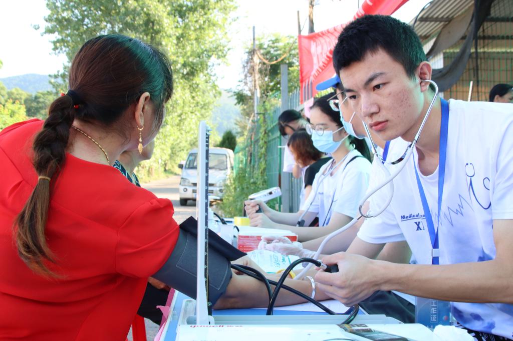 7月14日上午六时三十分,湖南中医药大学医学院暑期三下乡社会实践团启航学校御龙湾校区和成龙校区的志愿者们分队整理好所需物资,前往集市进行义诊和送药活动。烈日当头,志愿者们心中也热情似火,迅速进入了工作状态。他们洋溢着微笑,耐心地向前来询问的老人家们表明三下乡活动“科普医学知识、关爱留守儿童、助力乡村振兴”的主旨。随后,志愿者们根据受诊者自身的不同情况进行量身高、血压和测体重、视力、血糖基础项目,再根据检查结果为其实行恰当的中医理疗项目,如拔火罐、艾灸、推拿、刮痧。每一位志愿者都尽己所能为活动奉献出自己的一份力量。