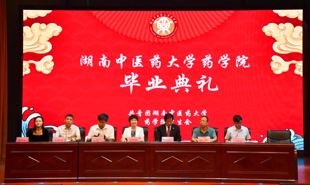 湖南中医药大学药学院2022年度“梦启筑韶华,‘药’你共前行”毕业典礼于2022年6月9日14:00在大学生活动中心圆满举行。出席本次活动的有药学院党委书记曹一瑜老师、药学院副院长王炜老师、药学院党委副书记杨岩涛老师、药学院副院长陈岩老师、药学院党委委员陈胜璜老师、药学院党委委员江星明老师、药学院党委委员及办公室主任唐宇老师、药学院学生科老师和毕业生班班主任。