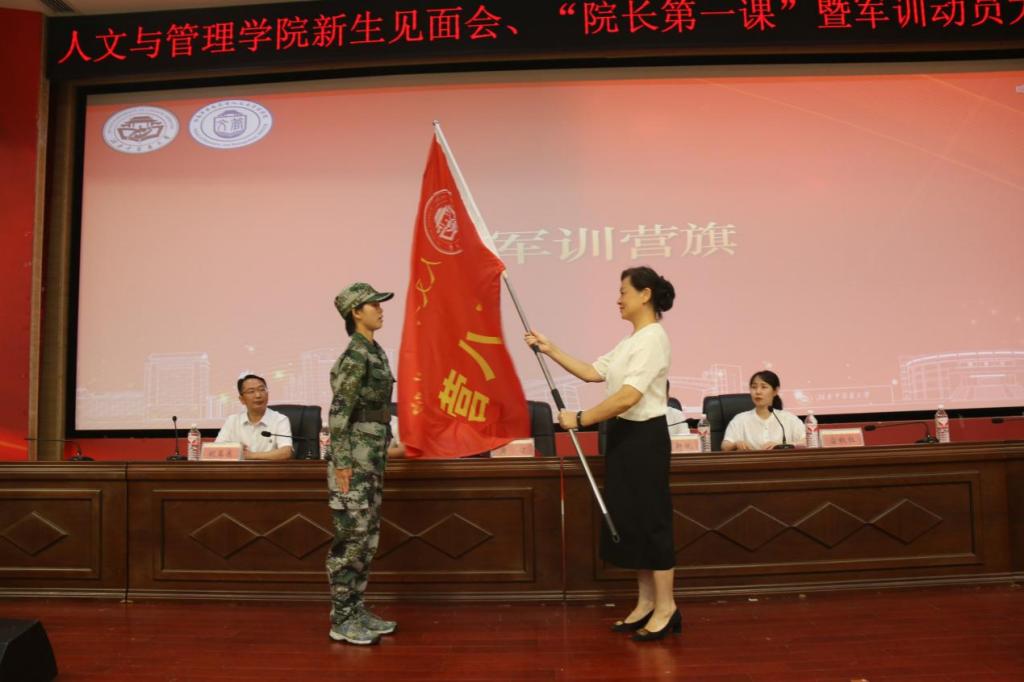承训学生教官代表韩广胜发言,他宣读了本次军训的管理规定,并表示会以身作则,用实际行动诠释责任与担当。新生代表李雨珊表示会严格遵守纪律与要求,勇于挑战自我,以饱满的热情投入到军训中。随后,由黄汀为军训营授旗。