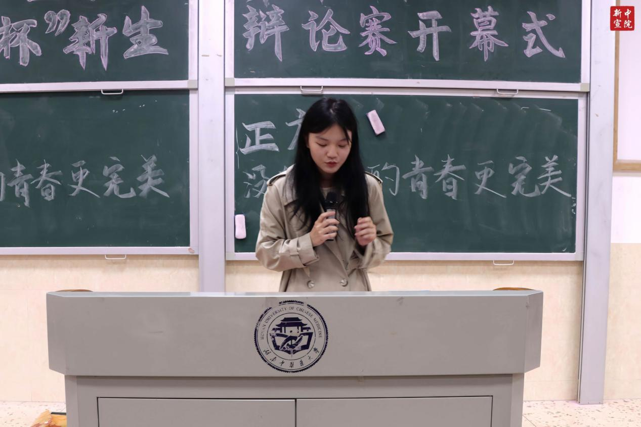 辩论赛总负责人陈甜甜讲话。她提到辩论赛要拥有知识面,甚至流行时尚都要有所涉猎。她表示在大学众多知识竞赛中,唯有辩论赛竞争最激烈,一句话可以引领赛场风云。最后她以墨子的“辨者,将以明是非之分,审治乱之纪,明同异之处,察名实之理”作总结,愿所有同学在此次辩论赛中辩出风度、辩出风采!