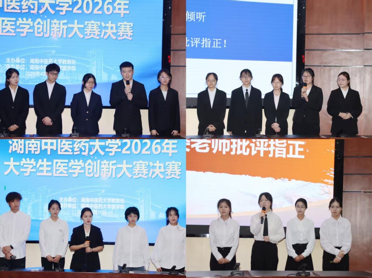 4月11日,湖南中医药大学2026年大学生医学创新大赛决赛于含浦校区国际教育学院一楼学术报告厅落下帷幕。本次大赛由学校教务处主办、医学院承办,经过前期初评,共有32支参赛团队晋级决赛,在基础临床、药学中医药、口腔医学、法医学、预防医学、交叉学科及国际竞赛七大板块展开激烈角逐。大赛由医学院副院长何迎春主持。