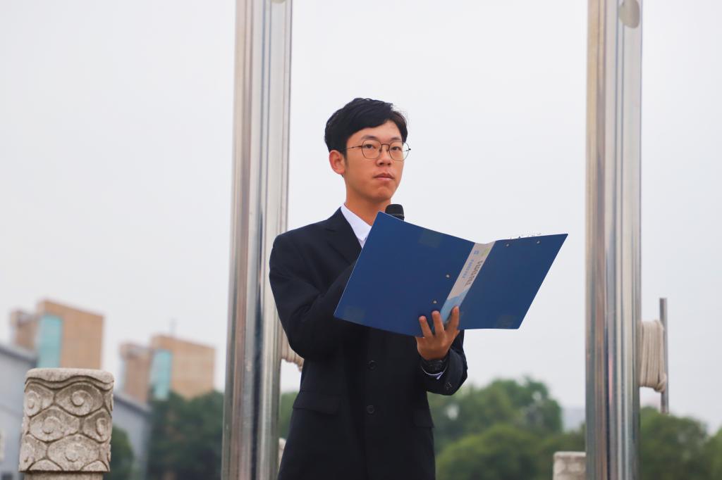 药学院新生代表刘人宇在国旗下发言。他认为大学对于青年人的意义在于提升自我,为建设更强大的国家蓄积力量,并呼吁新时代青年要秉承湖中大校训,成为有责任、有担当的国之栋梁。