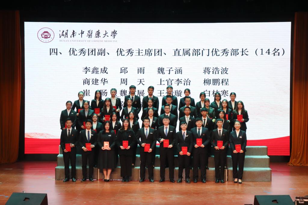 晚会对第六届学生委员会优秀主席团、优秀部长、优秀副部长、优秀干事进行了表彰,并为新一届学生委员会主席团、校团委直属部门及部长团颁发聘书。参加过“三下乡”社会实践活动、福建中医药大学交流活动、湘宁交流红色访学活动、首届全国中医药院校大学生骨干培训活动的学生代表于紫娜、魏树展、李俊龙、王凯分别分享了收获心得。