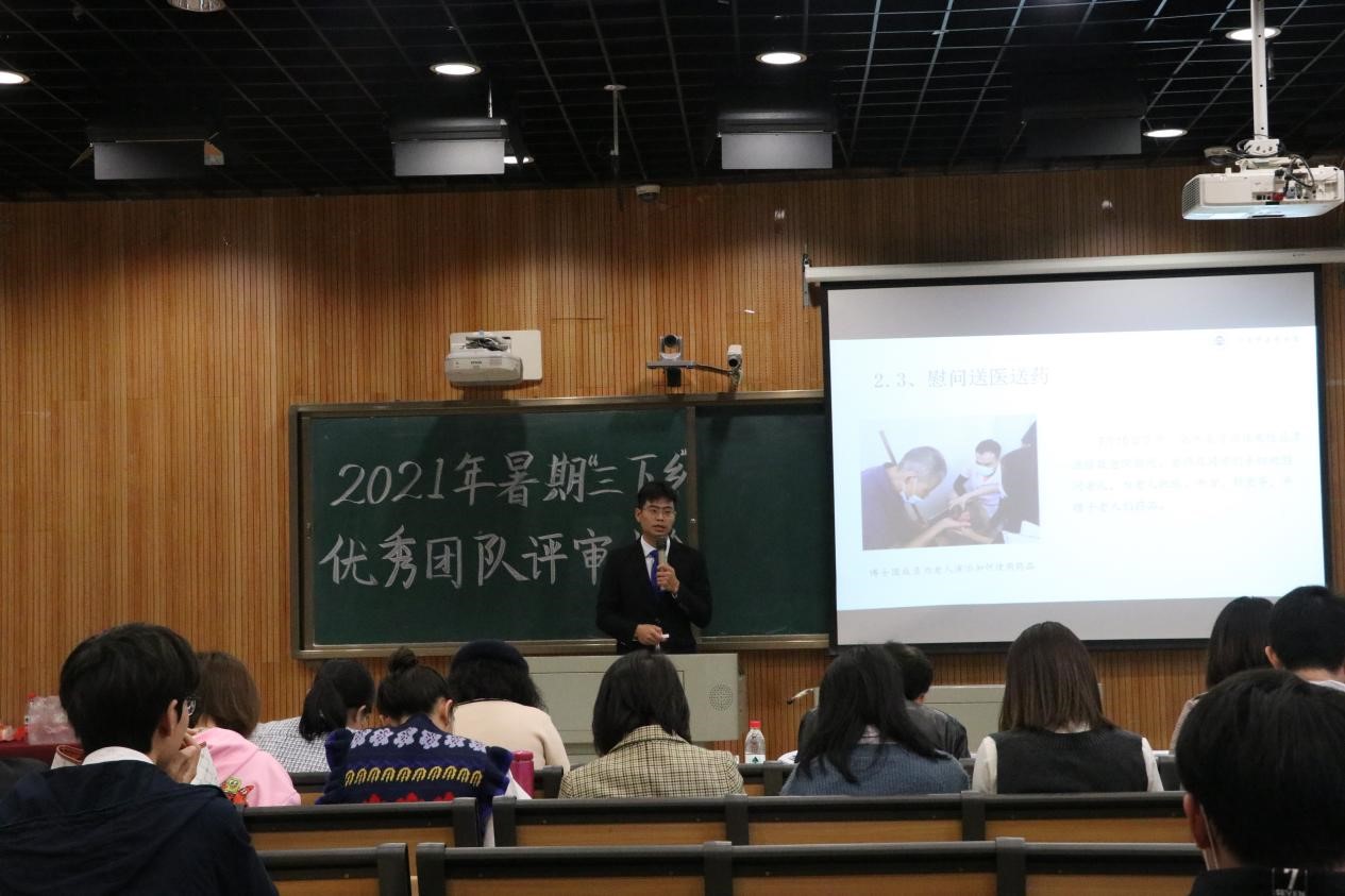 评审报告会分为团队实践情况报告、评审提问等环节,各团队精心准备,以图片、视频多种形式展示团队实践足迹和青年学子投身乡村振兴的突出成果。经公开评审,拟推荐杏林烛光支教队、马克思主义学院“忍冬花开”社会实践调研团等2支队伍为省级“三下乡”优秀品牌项目;护理学院翼志愿服务团、针灸推拿与康复学院暑期“三下乡”社会实践团等2支队伍为省级“三下乡”优秀团队;谢思健、罗尧岳、张湘卓、逯晶、杨岚清等5人为省级“三下乡”优秀指导老师;邹念念、张斯皓、李雨颖、龚棚宇、罗雄中、张宜帆、黄灵鹤、柳思聪等8人为省级“三下乡”优秀个人。另评选出中医学院师生志愿者服务团、中西医结合学院“永远跟党走,健康新农村”乡村振兴实践队、医学院皓齿明眸暑期社会实践团、人文与管理学院理论宣讲实践团等4支队伍为校级“三下乡”优秀团队;盛凯琳等13人为校级优秀指导老师;杨凡等96 人为校级优秀个人。