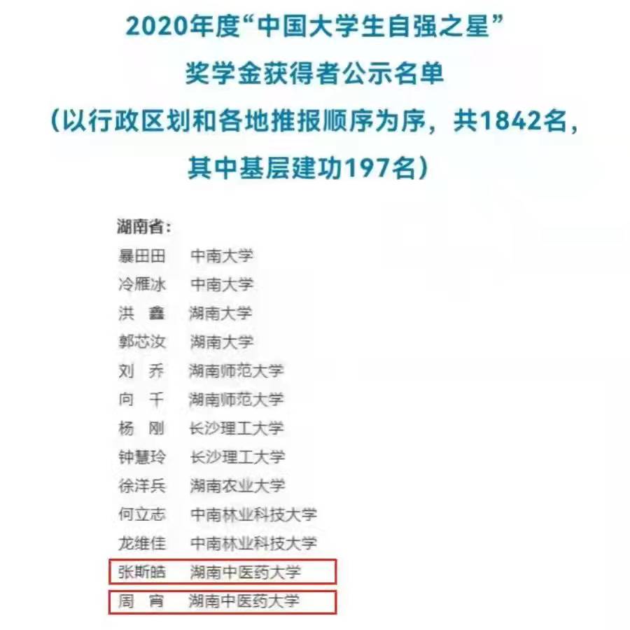 近日,由共青团中央、全国学联指导、中国青年报社开展的2020年度“中国大学生自强之星”奖学金名单揭晓,我校张斯皓、周宵两位同学荣获“中国大学生自强之星”奖学金!