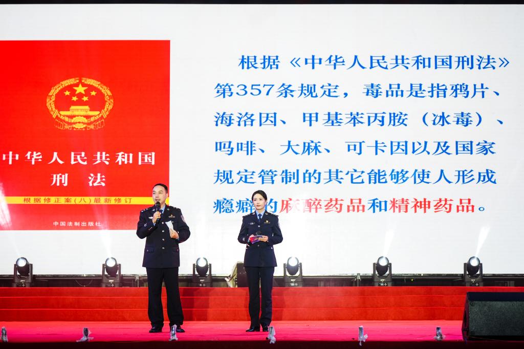 仪式现场设置有反电诈禁毒宣传展位,参与师生踊跃互动,公安、司法戒毒普法志愿者团队民警结合毒品仿真模型、反电诈真实案例等,详细阐述涉毒涉诈陷阱和法律风险,科普禁毒和反电诈知识。